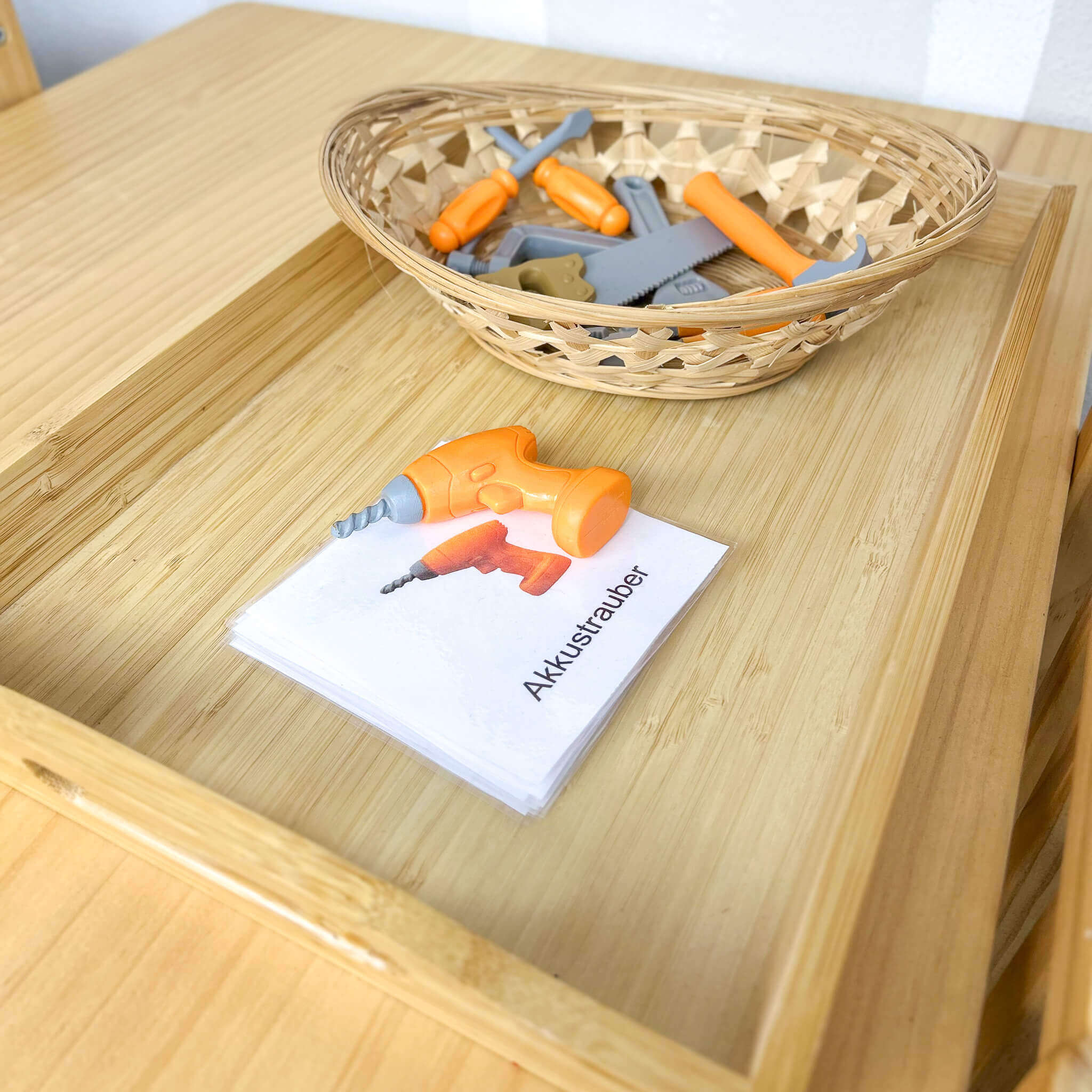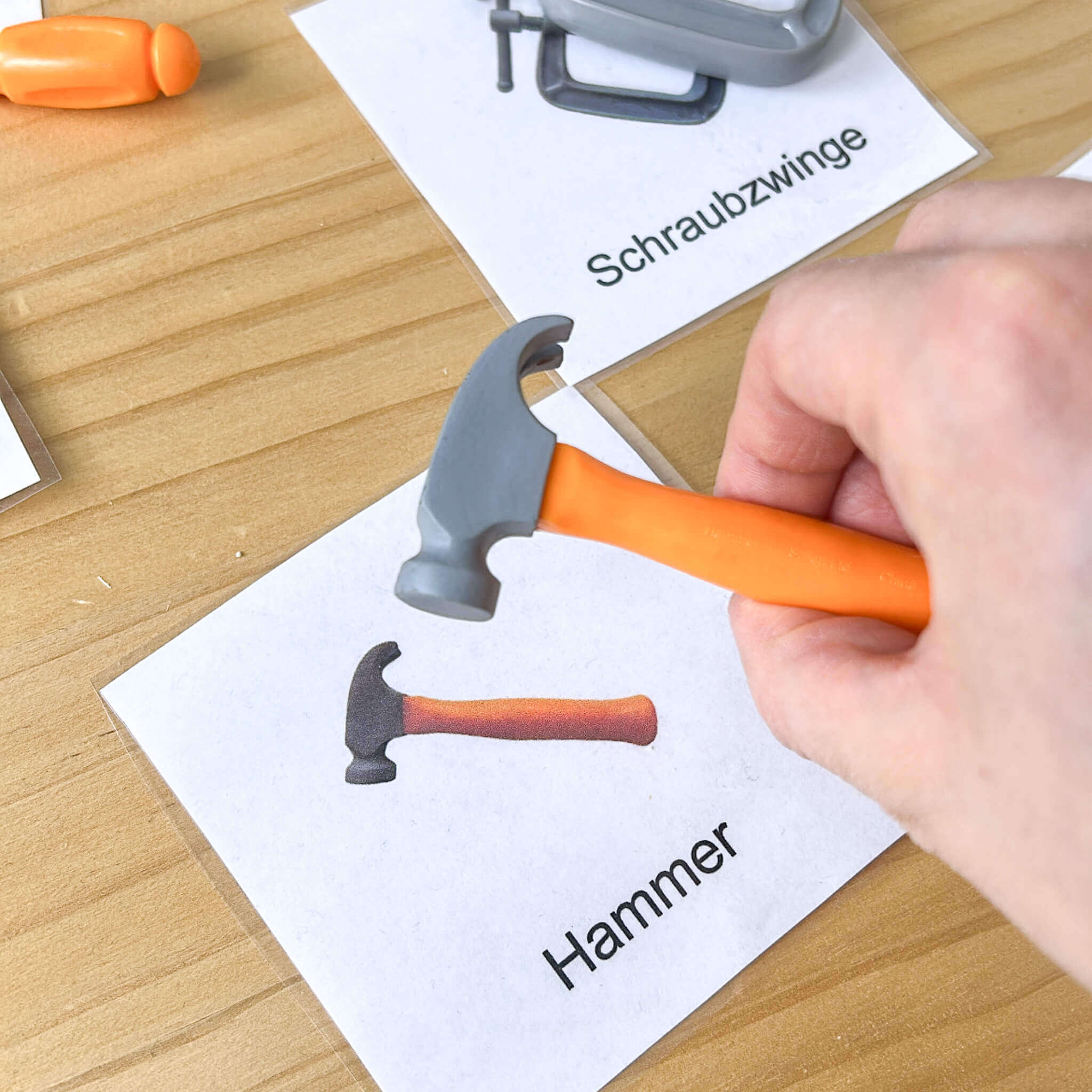 Zusätzlich zur Druckvorlagen benötigst du für dieses Lernspiel diese Werkzeugmodelle für Kinder* (sind nicht im Preis inbegriffen).